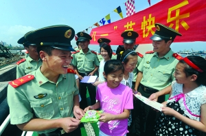 当日,青岛市莘县路小学学生来到山东海警二支队警营与官兵们一起联欢,并送上写满真挚话语的祝福卡,共迎“八一”建军节。
