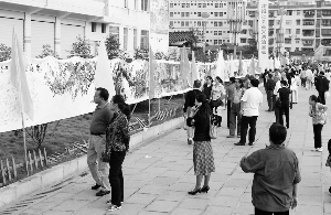 | 10月1日早晨,永顺县在“湘潭文化休闲广场”入口处悬挂着一幅60米长画卷,吸引了很多前来广场游玩的群众。这幅画是由200多名青少年代表所描绘,其内容是“中华盛世、溪州美景”。图为悬挂着的长画卷和绘画现场。 唐启武 摄 |