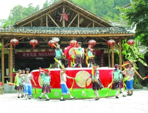 10月1日,凤凰山江苗族博物馆为了庆祝国庆,用一个二十二面多功能组合型苗鼓一展雄姿。此苗鼓是该馆作坊龙求正大师于7月28日所制作,鼓身直径5米,高1.1米,周长15米,大鼓上面还配有一个四面鼓。细看则是“二十二面鼓”,拆开,一次性可容36个人同时敲打,是目前世上独一无二的一面鼓。