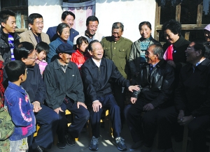 随后,温家宝来到村子里看望村民。在贾信家的院子里,总理亲切招呼村民们坐下,与大家聊起家常。好客的主人端来一盘煮熟的土豆,请总理尝一尝。温家宝拿起一个津津有味地吃了起来,夸奖说“味道不错”。
