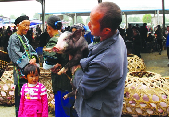 10月17日,逢吉首市乾州墟场赶集,不少农户在选购仔猪。由于国家多项扶持养猪政策的贯彻落实,加上市场肉价稳中有升,极大地提高了广大农户养猪的积极性。 陈绪新 摄