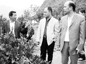 日前,龙山县里耶镇比耳村柑橘大户石宗林(左),在给政协龙山县里耶组委员介绍今年柑橘产量及销售前景。