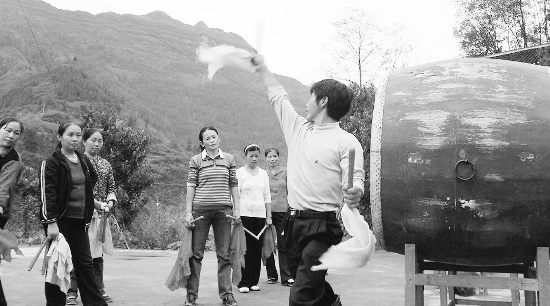 杨再宏是中国第一代苗族女鼓王龙英棠的儿子,从小接受母亲熏陶的他,练就了一身好鼓技,先后创作了“丰收鼓”、“猴儿鼓”等10多种苗鼓新打法,多年来辗转到周边几县市传授鼓艺。图为10月20日,杨再宏在保靖县夯沙乡夯沙村义务教鼓。 金 敏 摄