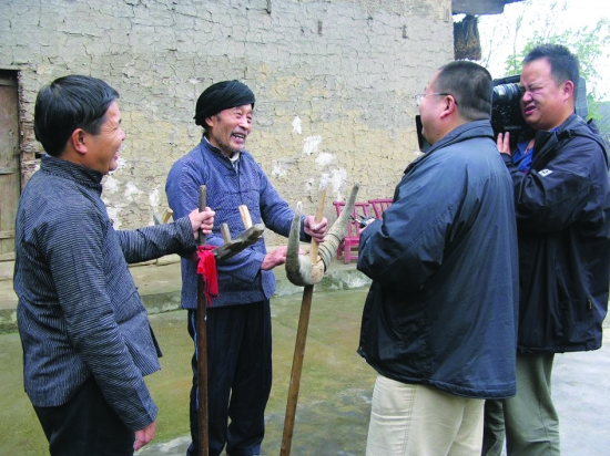10月29日,花垣县麻栗场镇金牛村82岁的退休教师石仕侦,向前来采访的CCTV—4《走遍中国》栏目记者介绍苗族武术及器械。石仕侦精通武术、善打苗拳,于2008年获评我省非物质文化遗产项目———苗族武术传承人。在他的长期传教下,如今金牛村习武健身蔚然成风,已有60多名男女青年成为善武者。 龙艾青 摄