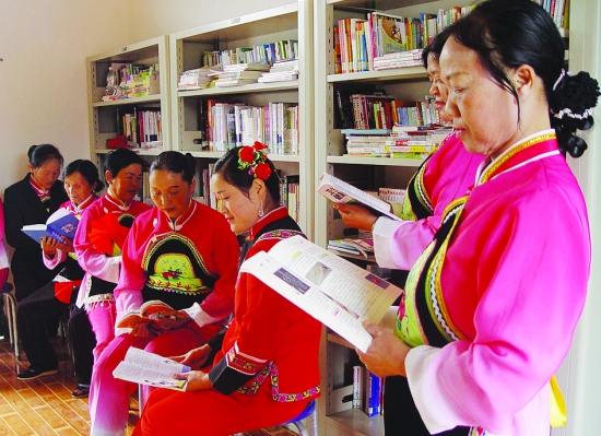 图为10月28日,一群土家大娘大嫂正在农家书屋看书。龙山县农车乡马蹄村创办的农家书屋,每天都有不同年龄的村民在这里汲取精神营养,孩子们在这里开阔视野,村民们在这里寻求致富经验,这已成了该村一道风景线。 邓德志 摄