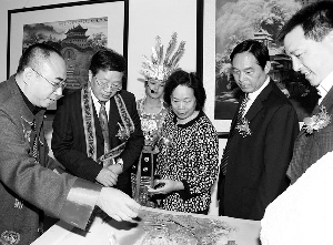 ▲沙石画作者胡文峰(右一)给省州领导演示沙石画的制作。