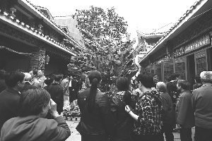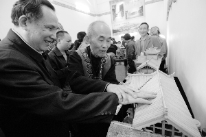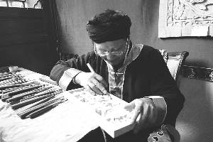 盲人摸展:民间工艺展吸引了无数市民来观展,吉首一盲人在家人带领下来到龙山展厅,竹雕工艺师王仕辉手把手引导盲人触摸竹雕工艺品———土家吊脚楼。
