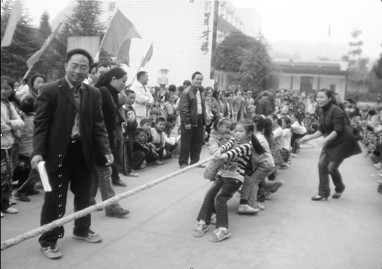 花垣县龙潭小学今春以来,自筹资金20余万元,实施校园绿化、硬化、美化建设。图为11月5日,该校在刚建好的体育场上举行“首届红领巾体育艺术节”拔河赛。“培育阳光孩子,构建和谐校园”系列活动也就此拉开了序幕。 张耀成 吴松龄 摄