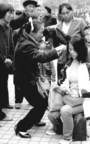 11月5日,在龙山县城时代广场,一名来自农村的中年女理发师,正在给一名青年女子拉头发,吸引了过往行人驻足观看。 易长松 摄