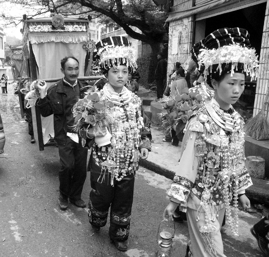凤凰县禾库镇禾库村2组村民石青龙和二儿子石世祥,租地20亩种烤烟,获得很好的经济效益,长子石世勇买车跑运输,一家生活红红火火。11月1日石青龙用苗族最隆重的礼节“花轿迎亲”为二儿子娶媳妇,一路吹吹打打吸引了众多的游客和群众。图为迎亲队伍抬花桥通过村寨时的热闹场景。 程明君 摄