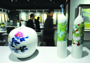 当日,为期11天的“辉煌60年———景德镇陶瓷成就成果展”在北京国家大剧院开幕,展出1000余件精美陶瓷展品,陶瓷工艺大师在现场表演精湛的工艺手法,并与观众进行交流,全方位展示新中国成立60年来江西省景德镇市在艺术陶瓷、日用陶瓷、高科技陶瓷和创意陶瓷等方面的成就成果。 新华社记者 罗晓光 摄