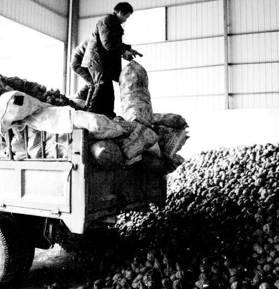 11月28日,龙山县金山实业公司交售红薯的农民正将红薯卸车。近年来,该县大力发展农业产业化企业,为多数农产品提供了稳定的销售渠道,促进了农民增收。 易长松 摄