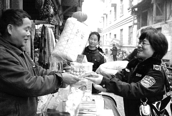 11月29日,凤凰县城区景区管理行政执法局对古城区里的经营贫困户进行慰问。该局在城区景区管理中,为老百姓办实事1000多件,入冬后,又为13户贫困经营户送棉被13床、慰问金3900元。 张顺心 摄