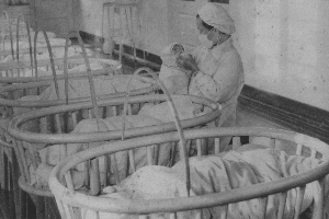 ▲农业生产合作社建立后促进了农村经济迅速发展,城乡卫生事业的改观改变了过去“只见娘怀胎,不见儿走路”的悲惨景象。湘西第一人民医院设立了婴儿室,每天都要接待许多新生的小宝宝(1957年)。