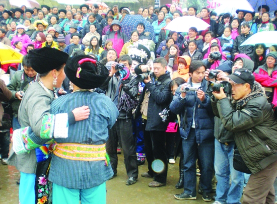 1月9日,花垣县排碧乡板栗村的苗族大嫂在对唱苗歌。当天,来自四面八方的游客与当地苗族同胞一道欢欢喜喜庆丰收,过苗年。清脆的苗歌、华丽的苗族服饰、苗家浓郁的风土人情、古朴独特的民族文化给游客留下了深刻的印象。 龙 科 王 帆 摄