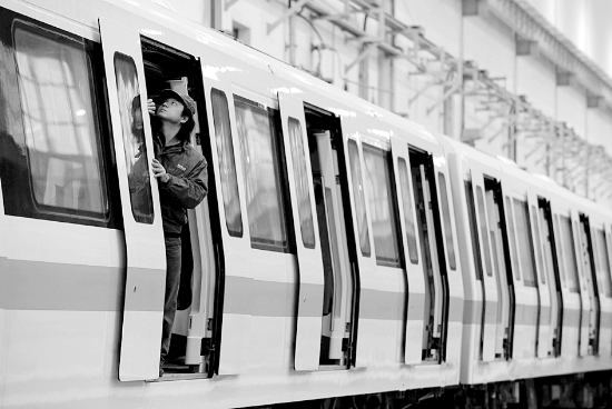 在南车株机公司车间内,一名工人正在一辆即将下线的城轨车辆车厢里工作(1月18日摄)。 随着近年来国内外城市轨道和铁道交通迅速发展,国产电力机车、城轨车辆制造商———中国南车株洲电力机车有限公司订单不断,2009年度销售收入突破百亿元。从2008年开始,南车株机接到国内外各型电力机车订单上千台、轨道车辆超过800辆,产品成功进入欧洲、中东等地轨道交通市