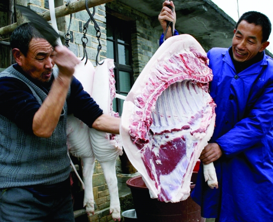 1月20日,龙山县石羔镇永兴村第二组63岁的土家族屠户黄中体(左),为该村村民杀年猪时,正在砍一块“反刀肉”,用来烹调美味可口的刨汤肉。湘鄂边区土家人杀年猪时,用“反刀肉”烹调刨汤肉,意寓来年丰收,吉祥。 易长松 摄