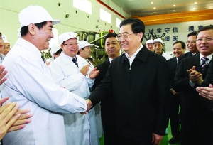 陕西法士特汽车传动集团有限公司和西安西电开关电气有限公司都是有几十年历史的老国有企业,这些年通过自主创新,在同行业中占据了重要地位。在陕西法士特汽车传动集团有限公司的巨大厂房里,胡锦涛察看了齿轮加工、变速器装配和热处理生产线。得知这家企业靠自主研发拥有了20多项专利,去年在国际金融危机冲击的情况下销售收入仍比前年增长20%,总书记称赞这个成绩来之不易,鼓励他们进一步深化企业改革,进一步增强创新能力,始终保持产品技术优势,不断提高企业市场竞争力。在西安西电开关电气有限公司的生产车间,胡锦涛饶有兴致地观看百万伏级全封闭组合电器核心部件的总装过程。总书记对企业员工们说,要实现我国从装备制造大国向装备制造强国的转变,必须坚持走自主创新之路。他希望企业在引进、消化、吸收的基础上不断进行再创新,为振兴我国装备制造业贡献更大力量。