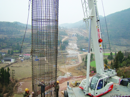1月27日,张花高速永顺境内18标段抚志特大桥施工现场工人们正在紧张工作。日前我省交通厅和省高速公路总公司在联合检查全省在建高速公路后,对永顺县高速公路建设作出结论:线路长,起步慢,但是速度快、质量高,在我省高速公路建设史上创造了一个“永顺速度”。 唐启武 摄
