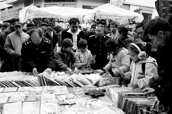 1月27日,凤凰县工商局执法人员到山江镇集贸市场清查淫秽色情音像制品。为切实维护全县春节和“两会”期间市场秩序及社会稳定,连日来,该县工商局积极协同县公安局、县文化局等职能部门对该县各大酒吧、网吧、KTV等休闲娱乐场所及书摊、音像制品店进行全面清查,切实开展好创建“五无”监管区工作,全面展开打击传销、“扫黄打非”、禁赌、禁毒、打黑除恶和反恐等