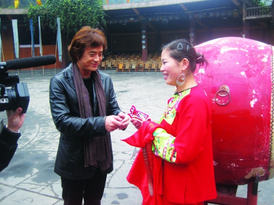 中央电视台《开心万里行》栏目组于2月2日来吉首市德夯苗寨采风。图为该栏目特约主持人、著名青年歌手黄格选与中国第五代苗鼓王黄娟切磋鼓艺,并向黄娟发出参加《开心辞典》抢答赛的《邀请书》。 刘 哲 摄