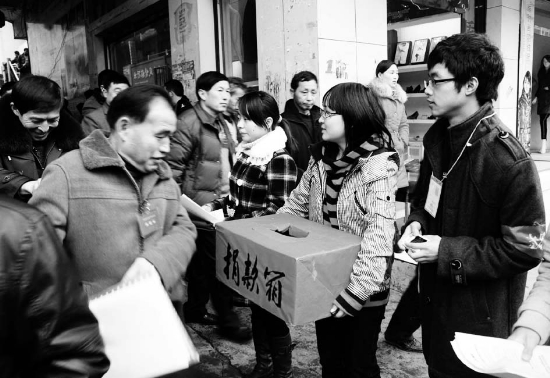 1月31日,龙山县8名回乡大学生在县城为留守儿童募捐。为过一个有意义的假期,8名放假大学生发起“为留守儿童捐赠一元钱”活动,每天在寒风中呼吁路过行人献爱心,目前已募集到爱心款5000余元,将全部用于为孩子购买防寒防冻衣物。 田良东 摄