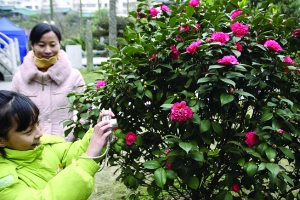 2月3日,在广西桂林虞山公园,市民欣赏盛开的山茶花。近日,广西桂林市街头和公园的桃花、山茶花、海棠花等竞相开放,迎接春天的到来。 新华社发(李 凯 摄)