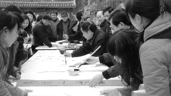 1月28日下午,州书法协会和州诗词楹联协会会员来到吉首市乾州古城社区开展送春联活动,为群众免费书写春联100多副。 王春艳 洪利华 摄