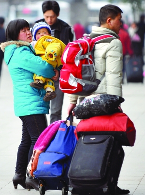 2月4日,一家三口来到南京火车站搭乘火车回家。