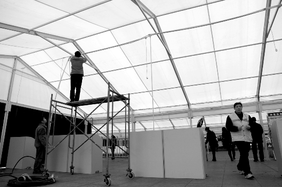 今年将是我国实行火车票实名制的第一年春运。春运从1月30日开始至今已近一周时间。面对今年春运的挑战。吉首火车站采取了一系列措施,在外设临时候车棚,在大厅内加强人手维持秩序等。图为火车站工作人员为临时性候车棚做最后的加固。 本报记者 彭 伟 实习生 黛卡梅妮 摄