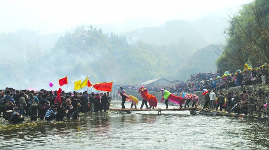 2月23日,吉首市矮寨镇大兴村百狮会狮子正在入场。为了丰富少数民族群众文化生活,传承民族民间非物质文化,该镇大兴村举行了一年一度的迎新春百狮会,近2万少数民族群众相聚大兴,为广大苗族群众送上了一台丰盛的民族传统文化盛宴。 陈绪新 摄