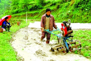春节刚过,苗乡掀起了春耕生产热潮。图为日前,保靖县葫芦镇傍海村农民在犁田。 向万银 摄