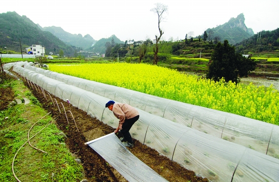 3月16日,吉首市寨阳乡矮板村村民在栽种蔬菜。近几天来,由于天气晴好,气温回升快,该市无公害蔬菜基地广大菜农纷纷下地种植和移栽辣椒、茄子等春季蔬菜。图为村民正在盖薄膜。 陈绪新 摄