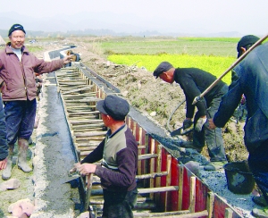 连日来,永顺县万坪镇党委、镇政府争取农业项目资金204万元,对岩洞、碑立坪、和平等5个村的10650米的排灌渠道进行了全面的整修,同时新修了上坪、碑立坪、和平等村的7条机耕道8.5公里,力争春耕生产之前全面完工,确保全镇6000多亩稻田的灌溉和排水,促进农民的增产增收。图为3月29日,村民们在上坪村修建排灌渠道。