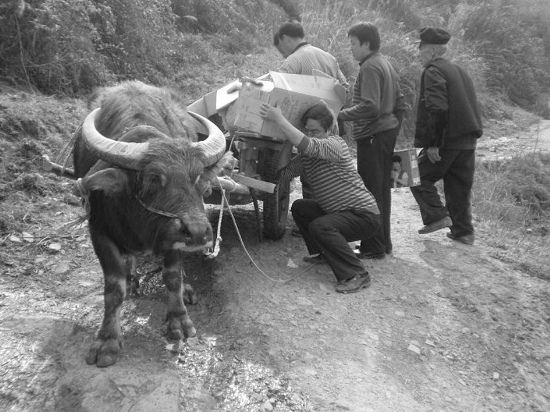 3月28日,记者来到保靖县毛沟镇白云山上的巴科村舍木科寨了解到,寨子里的人有的打工,有的迁走,孩子们下山读书,近50户人家的寨子,只有30多个老人在看守。通往寨子的公路长期失修,几乎没有车辆愿意开进寨子。挑不动背不起的老人们没办法,只好给水牛套上车架,从5公里外的山坳上拖生产生活用品进寨。图为外出的人回家看望老人,从牛车上卸货。 记者 龙清彰