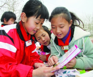4月1日,在山东省博兴县博奥小学,几名学生正在阅读刚刚交换的图书。