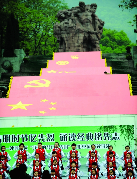 4月2日,一队小学生在烈士墓前合唱《烈士墓前的小花》。 清明节前夕,重庆市民纷纷前往歌乐山烈士墓进行祭扫活动,缅怀先烈。 新华社记者 周衡义 摄