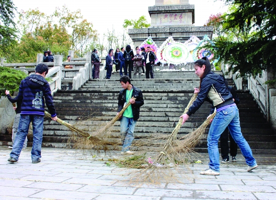 4月2日,几名中学生在龙山县烈士陵园清扫杂物。清明节临近,该县10余所学校中小学生代表先后前来缅怀革命先烈。为确保陵园的干净,该县皇仓实验学校学生们自带工具将祭扫产生的垃圾清扫干净,以实际行动告慰革命先烈。 田良东 唐荣沛 摄