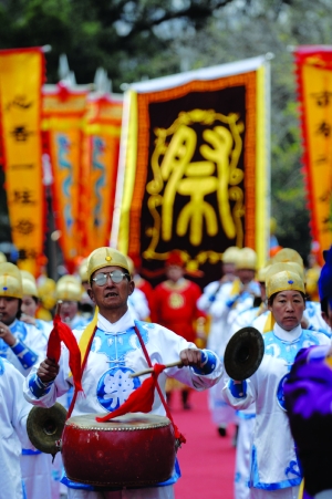 ①祭祀队伍走在黄帝陵前轩辕庙内。