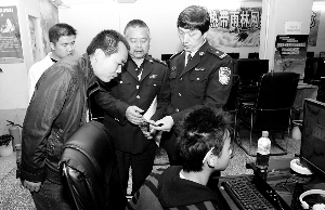 4月8日上午,永顺县文化局稽查大队联合公安、教育、工商等单位,开始对该县城镇120多家网吧进行实查和整治,并对接纳未成年人上网的网吧实施查处。图为检查人员在一网吧里对上网人员的年龄进行身份证比对。