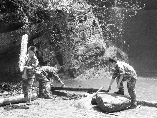 今年以来,湘西坐龙峡旅游开发有限公司与湘西猛洞河漂流公司联手推出“猛洞河景区25周年,景区回报父老乡亲”优惠活动,提升游客人气指数,景区实现了淡季不淡,接待人数比去年同期增长了200%。图为公司员工为迎接“五一”黄金周游客高峰,对景区环境卫生进行全面整治。 孔祥立 摄