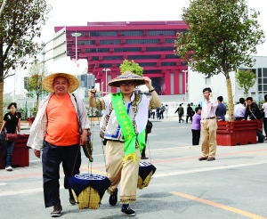 湖南民歌《挑担茶叶上北京》是上世纪五六十年代的经典作品,当年因为毛泽东主席亲口品尝了古丈毛尖茶赞不绝口而红遍大江南北。5月4日,湖南湘西古丈县土家族茶农吴清亮与他的父亲千里迢迢赶赴上海,在上海世博会期间挑着茶叶来到中国馆前,为宣传古丈茶叶和提高古丈茶叶的知名度、宣传世界和谐与绿色环保尽自己的一份力量。