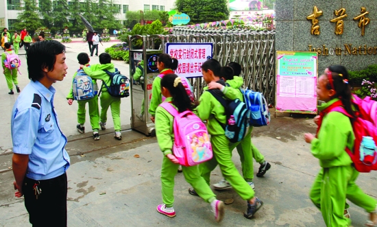 近期,全国接连发生了多起针对学生的校园恶性事件。省教育厅在5月5日决定对全省中小学幼儿园安全工作进行专项督察。吉首市各中小学校正全面加强校园安全管理。图为5月10日上午7时30分许,吉首市民族实验学校学生在保安的护送下进入校园。该校为保障学生安全,每天有专人巡逻,外来人员必须经校方同意登记后方可进入。 本报