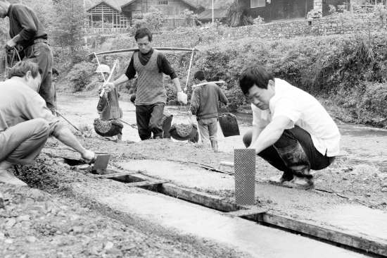 5月9日,保靖县水田河镇金落河村组织村民抢修被雨水损坏的渠道,以确保即将开始插秧的稻田用水。图为村民在技术员的指导下抢修水渠。 黄益民 摄