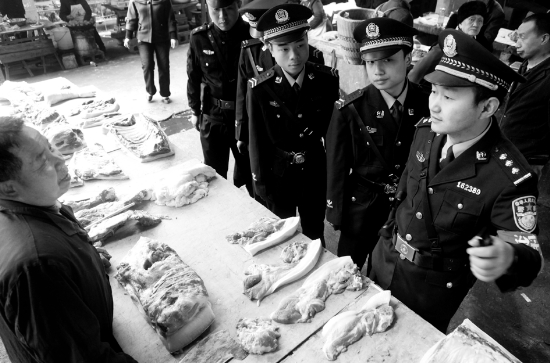 保靖县大力加大迁陵城区治安防控,对城区学校、农贸市场等重点防控区域实行定点、不定时、重点巡防,城区治安、刑事案件同比实现了大幅下降。图为4月26日,该县迁陵派出所巡防队伍正在该县老农贸市场巡防。并询问商家是否有可疑情况。 本报记者 彭 伟 特约记者 彭司进 摄
