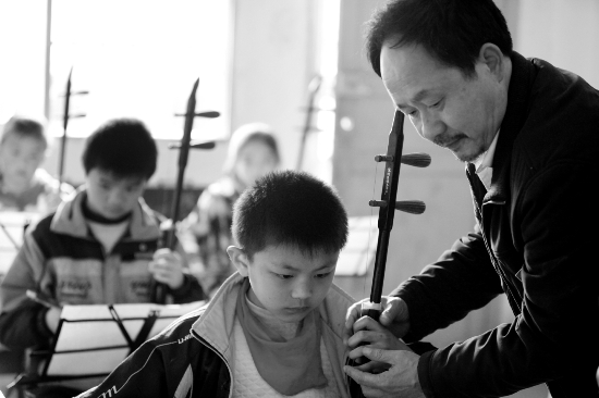 保靖县迁陵学校注重各种特色教育,挖掘学生音乐、美术、体育等方面的特长,实现学生全面发展,学有专长。图为该校音乐老师正教学生学习二胡。 记 者 彭 伟 通讯员 周水静 摄
