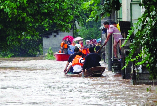 6月8日,吉首市遭到特大暴雨袭击,降雨强度大、雨量集中、最高达139.4毫米,致使山洪暴发,受灾范围广,当地军民奋力抗灾,组织自救。图为河溪镇社区当地军民用冲锋舟木船转移被洪水围困的群众。 陈绪新 摄