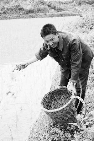 多日来的低温、阴雨天气使农田里的水稻秧苗生长缓慢、叶片发黄。为保证今年稻谷稳定增产,全州农民群众抓住不可多得的好天气,纷纷给秧苗施肥、灭虫。图为6月10日,永顺县芙蓉镇孔坪村农民孔庆喜在施用低碳的猪粪肥来提高农田的温度和养分。