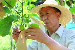 今年,凤凰县黄合乡、落潮井乡的红阳猕猴桃示范基地有500亩的红阳猕猴桃进入丰果期。为提高水果产品质量,打造名特优水果品牌,近日,该县以“省为贫困地区搭建科技平台”项目的实施为契机,投入资金2万多元,定制套袋200多万个,对示范基地的挂果进行套袋,助农增收。图为6月30日,该县落潮井乡塘桥村果农龙志生正在给自家的红阳猕猴桃挂果套袋。
