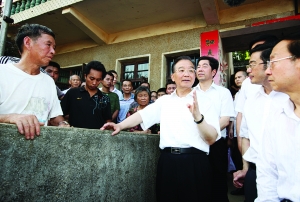 十几分钟后,车子行到清泉村村口,陈凯旋带着总理下车,抱歉地说:“村里路窄,车子开不进去了。”总理对他说,你头前带路吧。在陈凯旋带领下,沿着绿树掩映的乡间小道,温家宝来到大成桥镇福泉小学教学楼前,一个最长直径约70米,深有30多米、呈椭圆形漏斗状的大陷坑赫然在眼前。大坑边缘,一些民房由于塌陷只剩下一半颓立。大坑周围用粗粗的竹竿围起。温家宝走到大坑边认真察看,还向村民们了解塌陷情况。村民们告诉总理,这里本来就是沉陷区。今年以来连降暴雨,土质软化,5月8日以后沉陷区多次塌陷,形成了这个大陷坑。
